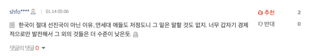 “韩国绝对算不上发达国家的原因..连延世大学的学生都这样,那些更差学校的就更不用说了。感觉是经济上突然发展得太快,其他方面的水平反而更低了。”