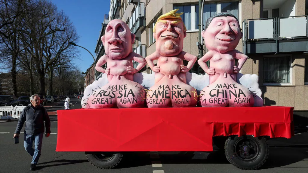 A person walks next to a carnival float by artist Jacques Tilly depicting Russian President Vladimir Putin, U.S. President Donald Trump and Chinese President Xi Jinping on the day of the traditional "Rosenmontag" Rose Monday carnival parade in Duesseldorf, Germany, March 3, 2025. © Wolfgang Rattay / Reuters