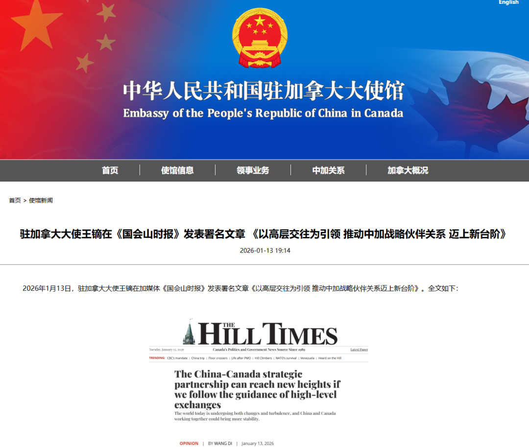 与此同时,驻加拿大大使王镝于1月13日在加拿大政治新闻媒体《Hill Times》上发表文章《以高层交往为引领 推动中加战略伙伴关系 迈上新台阶》。