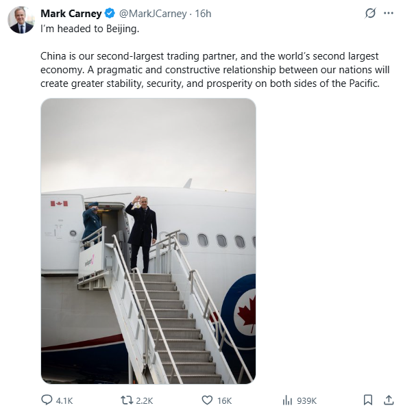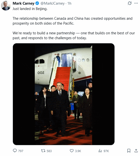 卡尼在社交平台X上发文:“我刚刚抵达北京。加中关系在太平洋两岸创造了机遇,也带来了共同的繁荣。我们已经准备好建立一种新的伙伴关系——在继承双方过往合作成果的基础上,积极应对当下的各种挑战。”