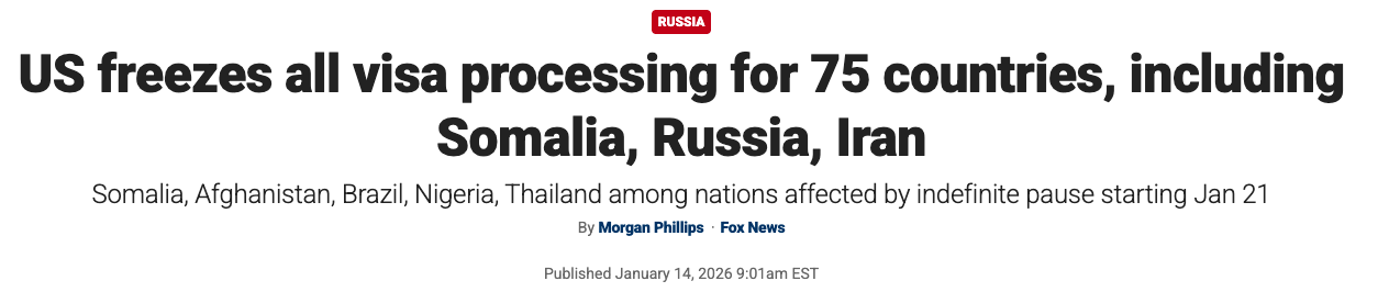 受影响国家包括索马里、俄罗斯、阿富汗、巴西、伊朗、伊拉克、埃及、尼日利亚、泰国、也门等。暂停措施将于 1 月 21 日正式生效,并在国务院完成对签证处理流程的重新评估前无限期持续。