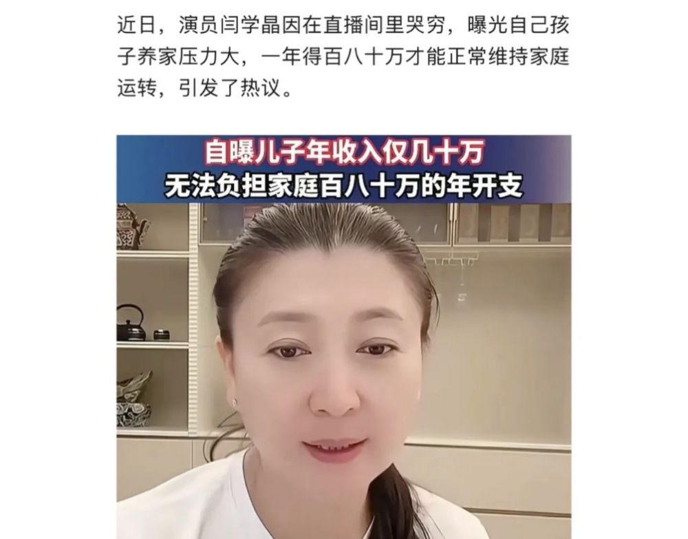 小品演员闫学晶在直播过程中谈及家庭经济情况,说32岁的儿子在北京生活压力很大,年开支必须80万至100万元才够养家,但儿子一年的收入仅为几十万元,家庭财务陷入困境。直播间里年收入三五万的网民被整迷糊了,这是哭穷还是炫富?这可能是哭穷式炫富,小品演员常用的反转艺术手法。