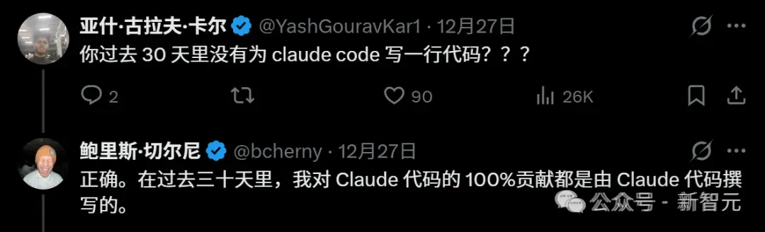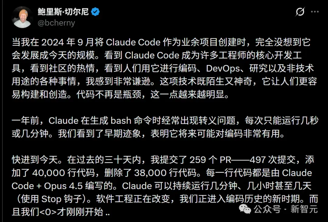 他亲口承认:过去三十天内,自己对Claude Code项目的贡献,100%都是由Claude Code自己完成的!