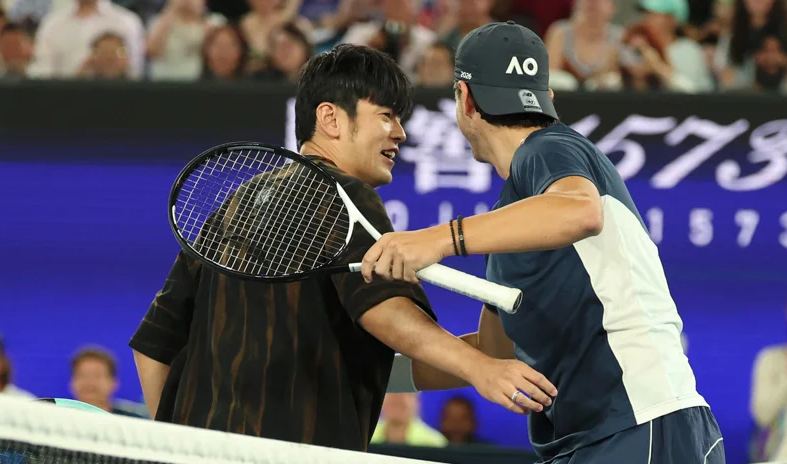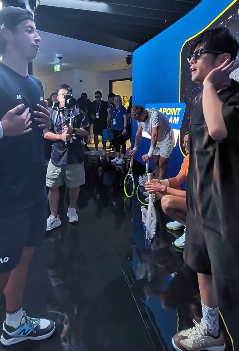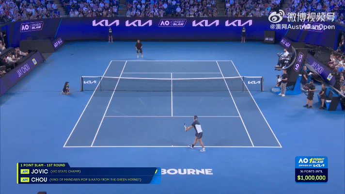 他对阵的是年仅24岁的澳洲陪练员 佩塔尔·约维奇(Petar Jovic)。周董戴着墨镜帅气登场,上场前还潇洒地将墨镜往场边一丢,引发现场欢呼,观众席上也有不少粉丝举着海报为他加油。