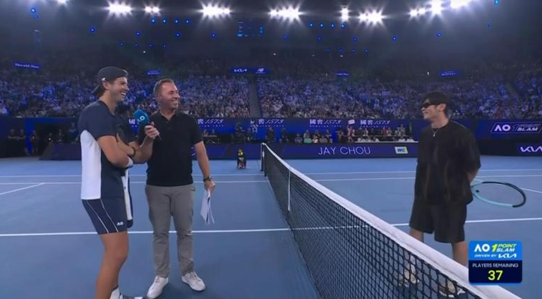 澳网官方介绍周杰伦时,称他是华语流行乐天王,也是曾在电影《青蜂侠》中饰演“加藤”的演员。赛前,周杰伦还与西班牙新生代球王卡洛斯·艾卡拉兹(Carlos Alcaraz)互动聊天,并兴奋地拿着自己的证件向对方展示,气氛相当轻松。