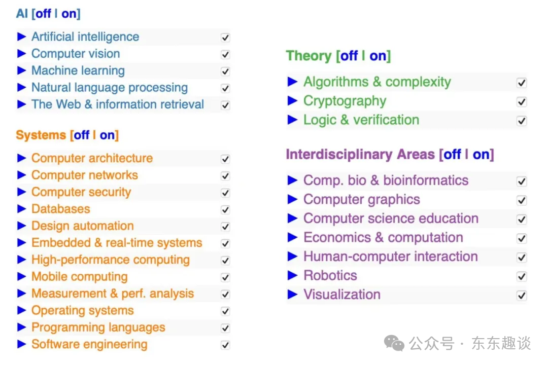CSRankings榜单将计算机科学领域分为人工智能、计算机系统、 计算机理、跨专业领域等四大板块,每个板块还包含了若干个分支。