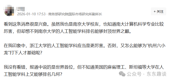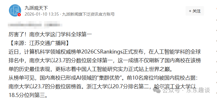 这个消息迅速成为2026年1月10日的热点;主要是在人工智能领域,我们一直是跟随美国高校与机构在走,现在大有扬眉吐气的味道。