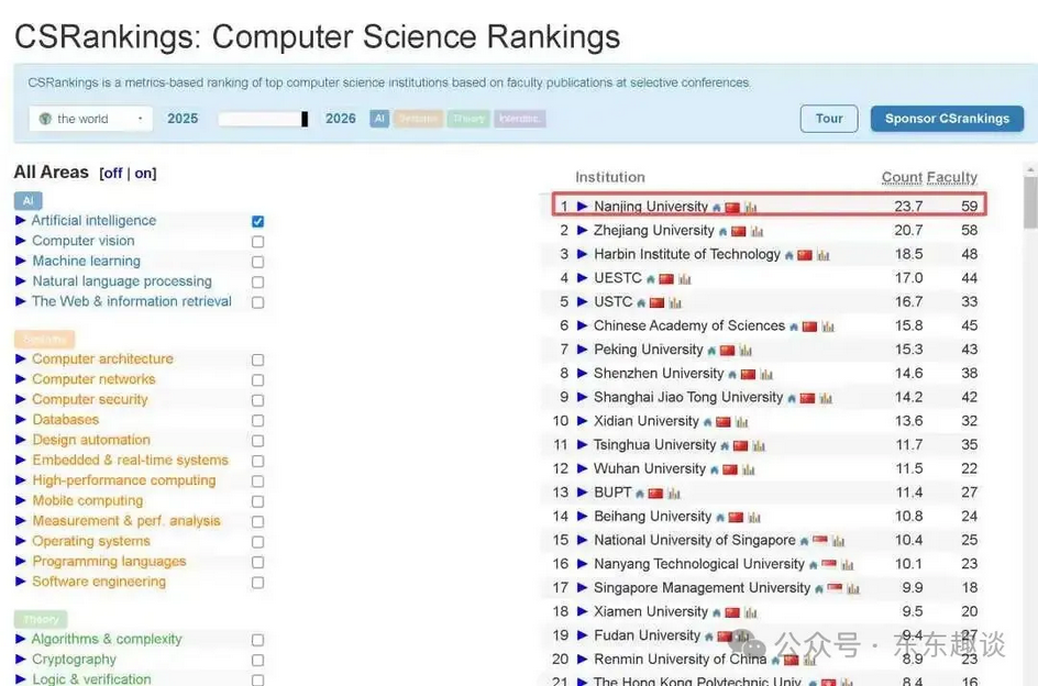 从网络的截图看,2026CSRankings人工智能方向,前十四名全是来自中国高校,第15-17名是来自新加坡国立大学、南洋理工大学与新加坡管理大学;足见我们在该领域的整体实力。