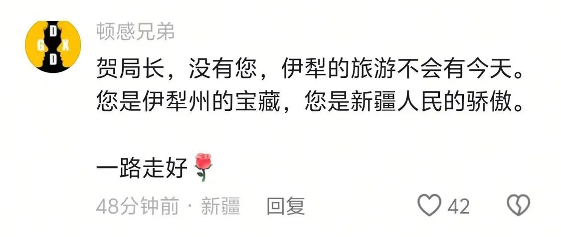 “辛苦你了,您的付出,新疆老百姓铭记于心。”“一路走好,您为新疆农产品做出了卓越贡献。”“贺局长,没有您,伊犁的旅游不会有今天,您是伊犁州的宝藏,您是新疆人民的骄傲,一路走好。”