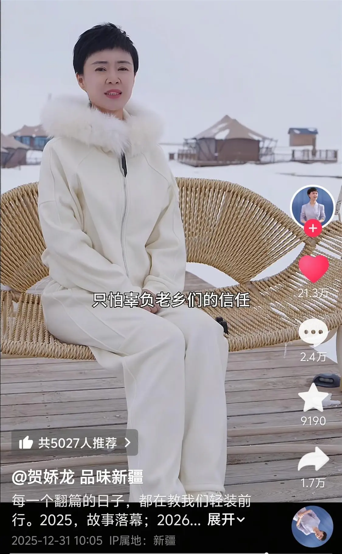 2025年12月31日,贺娇龙曾通过视频回望过去,对着镜头,她说:“我47岁了,于很多人而言,这个年纪或许意味着放缓脚步,归于平淡,但对于我来说,这是沉淀后的舒展,是仍能策马扬鞭的热血时刻。旁人见我,或许会赞美一句‘英姿飒爽’,可只有我心里清楚,在镜头背后,在策马间隙,那些为家乡特产奔波的日夜,那些对家人满是亏欠的瞬间,那些在风雪里咬牙坚持的时刻,是我不为人知的‘另外一面’。时间过得好快,这一年就要结束了,我想说几句心里话,敬那些为生活、为热爱默默咬牙坚持的你,还有背着新疆农产品到处跑的同仁们。”