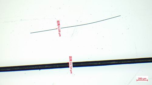 ②T1000级碳纤维单丝(上)与头发丝的对比。山西煤化所供图