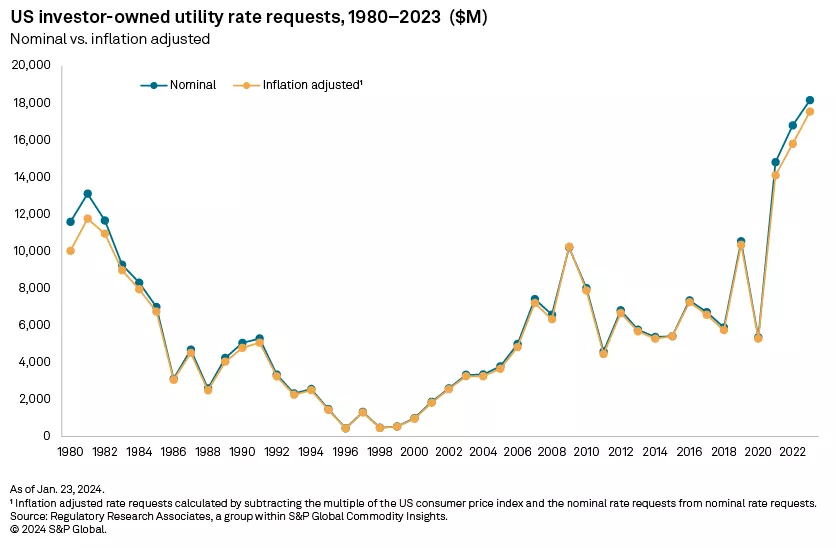 1980年至2023年,美国投资者所有的公用事业公司年度费率上涨数额,蓝线(名义数额)、黄线(通胀调整后数额),单位:百万美元 数据:标普全球