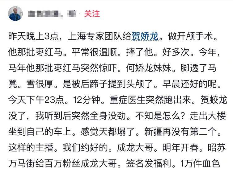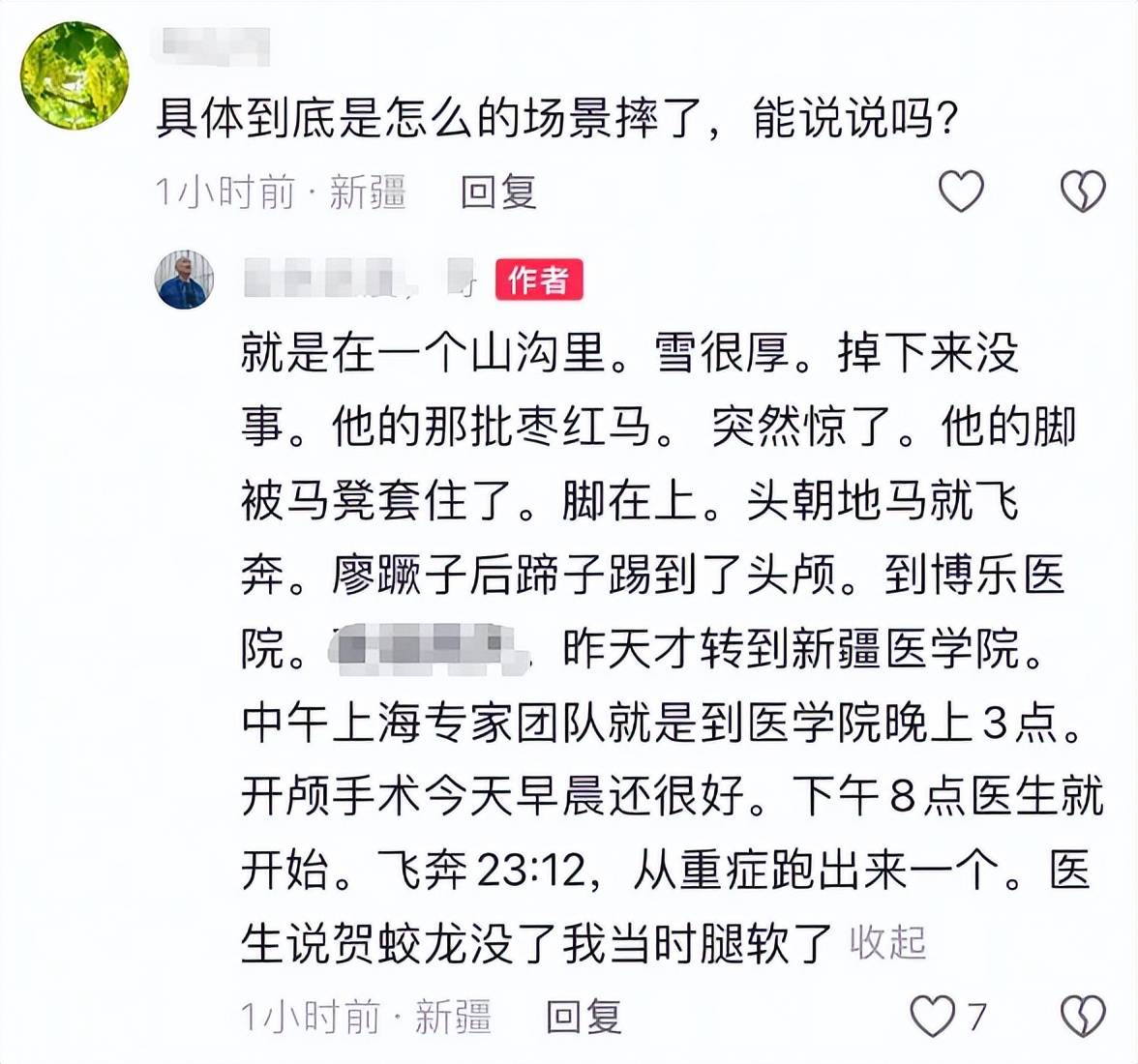 关于抢救细节,好友告知贺娇龙受伤后被送到了博乐医院,而后转到新疆医学院,上海专家团队做的开颅手术,早上还很好,到了晚上23点12分,从重症跑出来一个医生,告知贺娇龙没了。