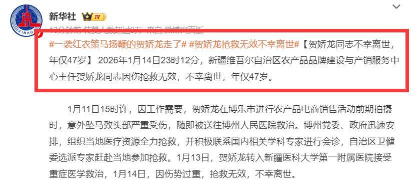 1月15日,令人遗憾的噩耗终究还是传来,经官方证实,网红副县长贺娇龙不幸离世,将生命永远定格在47岁。