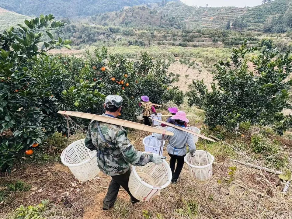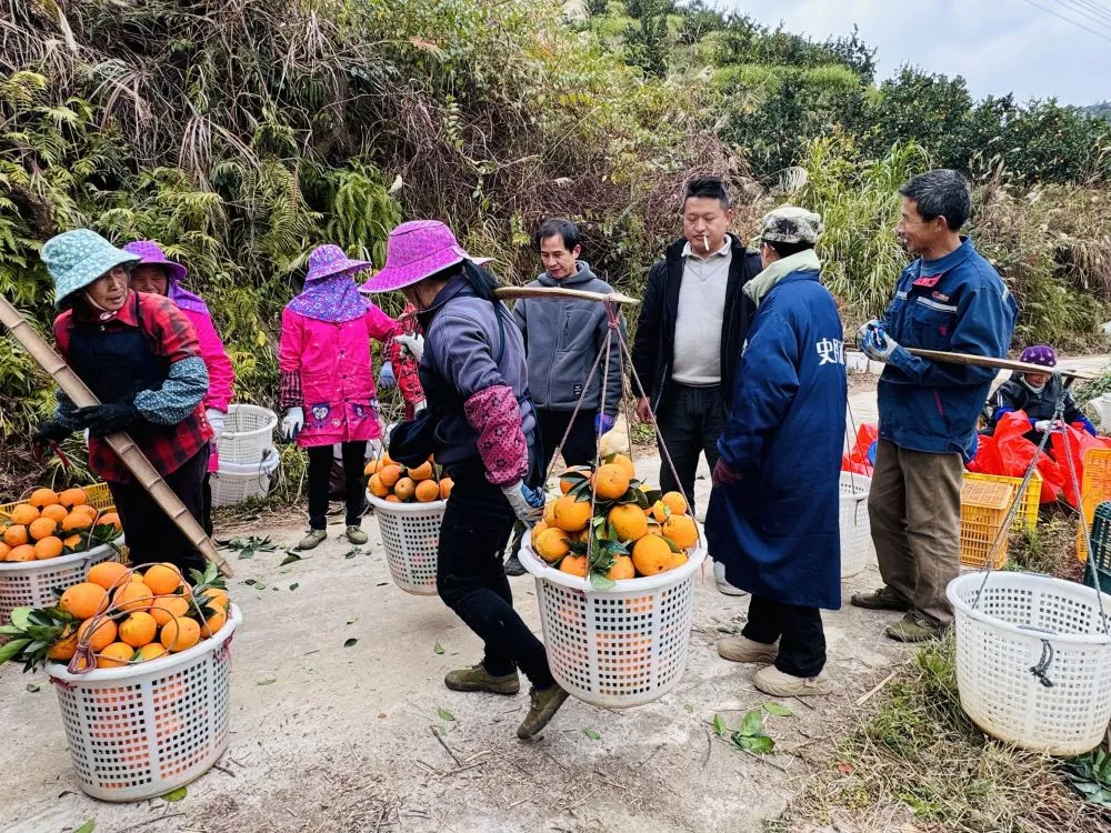 果树间的窄路只够两个人错身,采摘工人一趟趟把脐橙从林子深处抬出来,筐沿被手套磨得发白。土路旁四名挑果工,蹲下、弯腰、翻捡,动作熟练,坏果、烂果被随手挑出丢到一边。