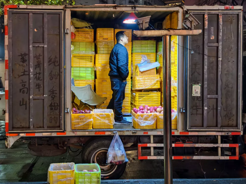 有的货车司机到地方后,直接低价出给批发市场,虽然利润薄,但能一口气出掉大半车,风险瞬间转移;有的走社区团购,提前在微信群里收订单,货到后用小面包车或平板车从大车上分装,一户户送上门。