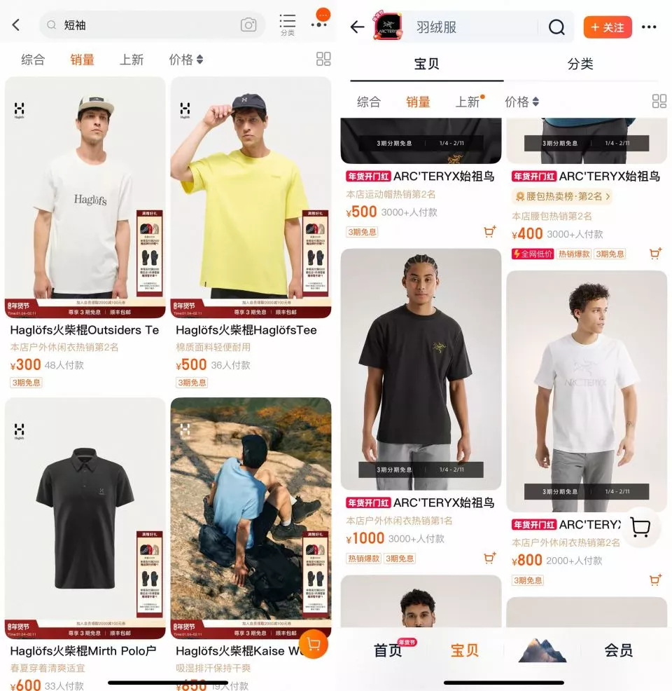 对比始祖鸟在官方旗舰店销量居前两名的T恤价格分别约为1000元、800元,火柴棍销量居前两名的T恤价格分别约为300元、500元,定位相对中端。