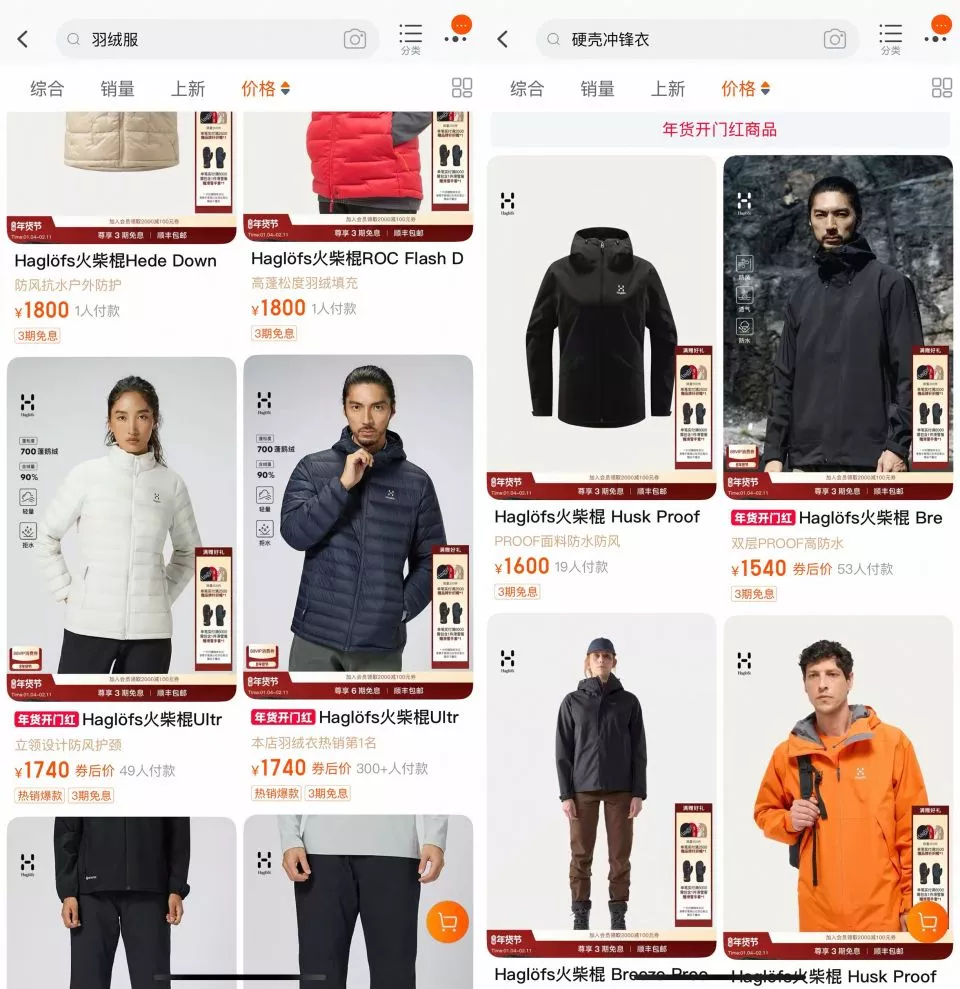 从定价策略看,火柴棍试图在专业性能与大众市场之间找到平衡。线上渠道价格带覆盖260-7500元之间,短款羽绒服1740元起,硬壳冲锋衣定价1540元起。