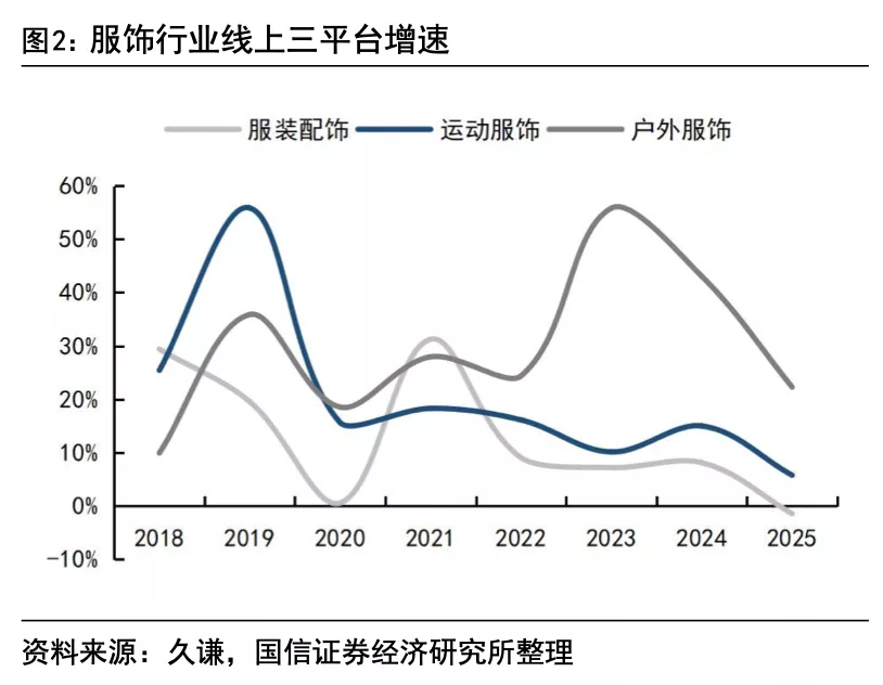 值得注意的是,2019-2025年,运动服饰与户外服饰的线上销售增速始终高于服装配饰整体,在近两年线上增速整体放缓的背景下,运动服饰和户外服饰表现仍然占优。