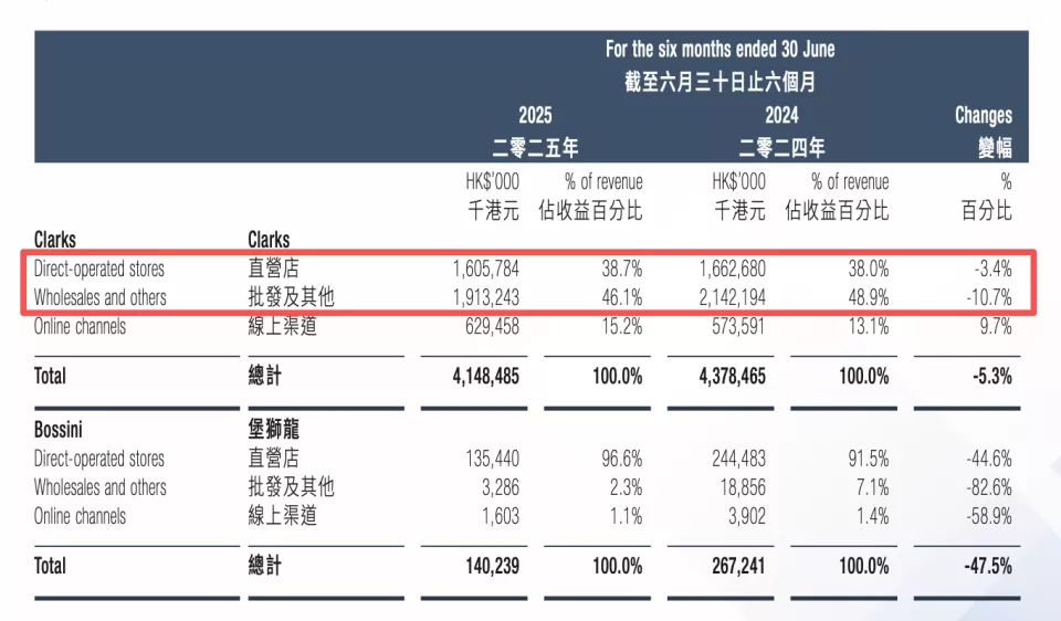 2022年完成收购的Clarks,虽试图通过跨界联名强化品牌“时尚”属性,并借助明星代言扩大知名度,但据2025年半年报,其直营渠道收入占比38.7%,仍低于批发及其他渠道。