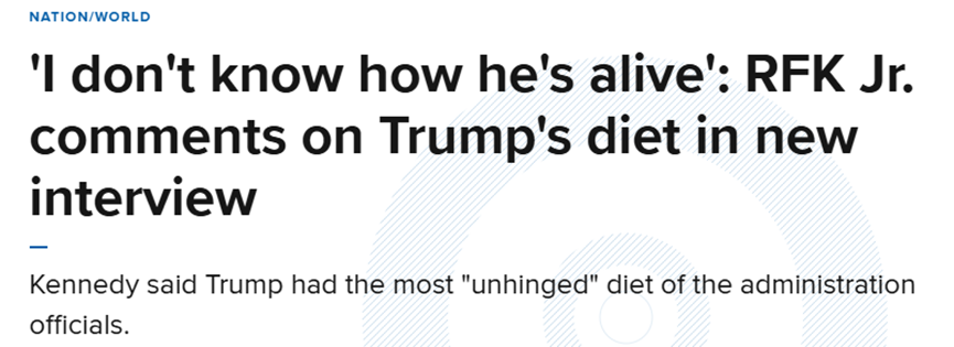 美国卫生与公众服务部部长小罗伯特·F·肯尼迪(Robert F. Kennedy Jr.)对川普总统的饮食方式发表了一番见解。