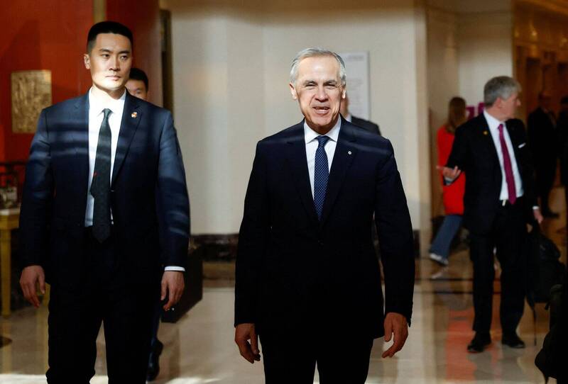 图为加拿大总理卡尼(前)15日现身北京饭店大厅,他是自2017年以来首位访中的加国总理。 (路透)