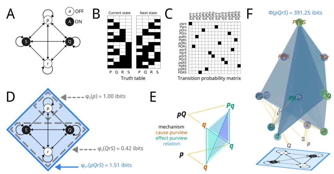 图1. (A) PQRS是由四个具有二进制状态的单元全连接组成的系统,每个单元以离散的时间间隔同步更新,且每个节点都存在自环。这里展示了系统状态为0101,也可以写成pQrS. (B)运行在系统A上的动力学;(C)与动力学对应的概率转移矩阵TPM;(D)IIT应用后得到phi值1.51(最不可约的复合体)(E)和(F)是pQrS未折叠的13个区分体(distinction)的因果关系