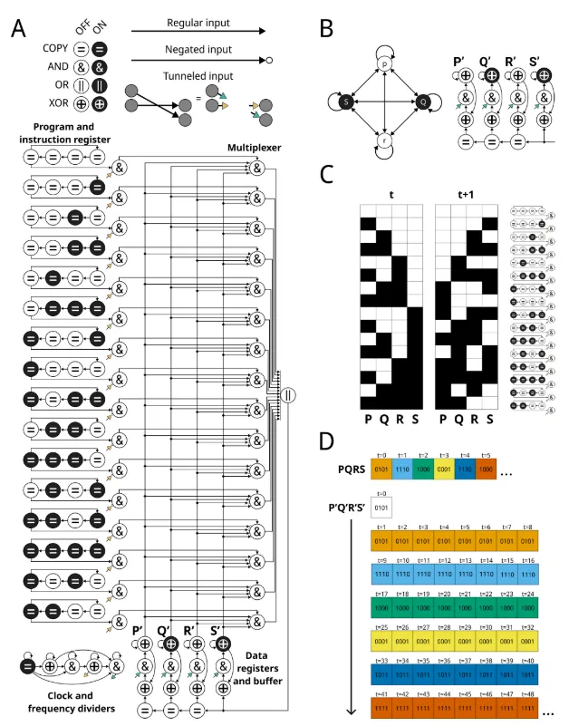 图2. 可准确模拟 PQRS 的 4 位计算机。(A)一款简单计算机可对 PQRS 进行任意时间步长的模拟。该计算机包含带分频器的时钟、编码 PQRS 转移规则的程序、四个存储 PQRS 状态的 1 位数据寄存器,以及一个类多路复用器处理单元。计算机的 117 个单元均执行布尔函数(复制、与、或、异或),状态分为关闭(白色)或开启(黑色)。为简化视觉呈现,采用彩色箭头(青绿色或棕褐色)替代黑色箭头表示特定连接。例如,时钟与分频器中最右侧的与门直接输出至数据寄存器中的每个与门。(B)可通过设置数据寄存器 P'、Q'、R'、S' 的初始状态,对计算机进行编程以编码 PQRS 的当前状态。(C)程序单元的初始状态用于编码 PQRS 的状态转移规则,程序所操作的数据为 P'、Q'、R'、S' 的当前状态。(D)每个寄存器每 8 个时间步更新一次状态,此时计算机开始下一轮模拟迭代。