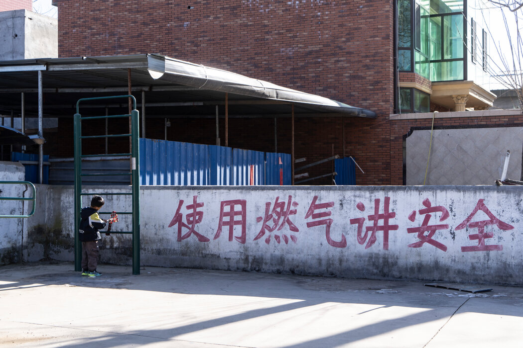 曲阳县那座村庄里,一条标语写着“使用燃气讲安全”,摄于周日。 QILAI SHEN FOR THE NEW YORK TIMES