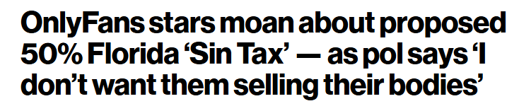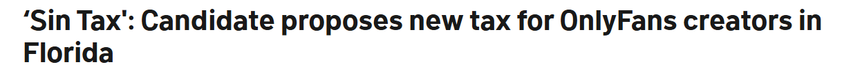 州长候选人詹姆斯·菲什巴克(James Fishback)在保守派播客NXR Studios的访谈中表示,若当选州长,他将在上任第一年推动对OnlyFans平台开征佛州首例此类税种。菲什巴克说:“作为佛罗里达州州长,我将对OnlyFans征收50%的罪恶税。”