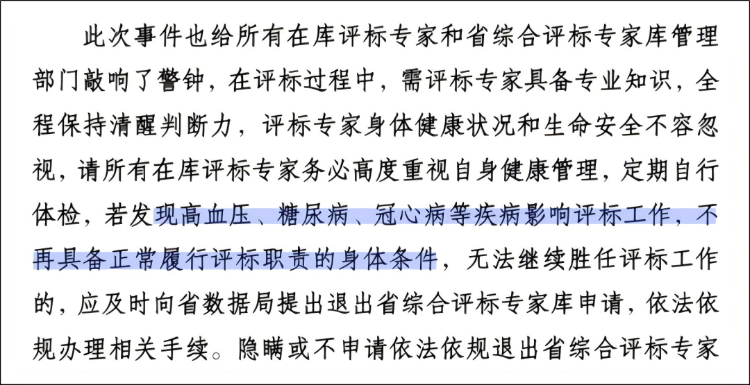 最后当然要说,这次事件给以后敲响了警钟,以后评标也要评评专家的健康状况。