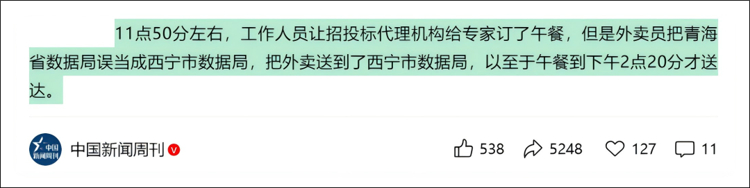 给专家点了外卖,但外卖员把青海省数据局误当成西宁市数据局,把外卖送到了西宁市数据局,以至于午餐到下午2点20分才送达。