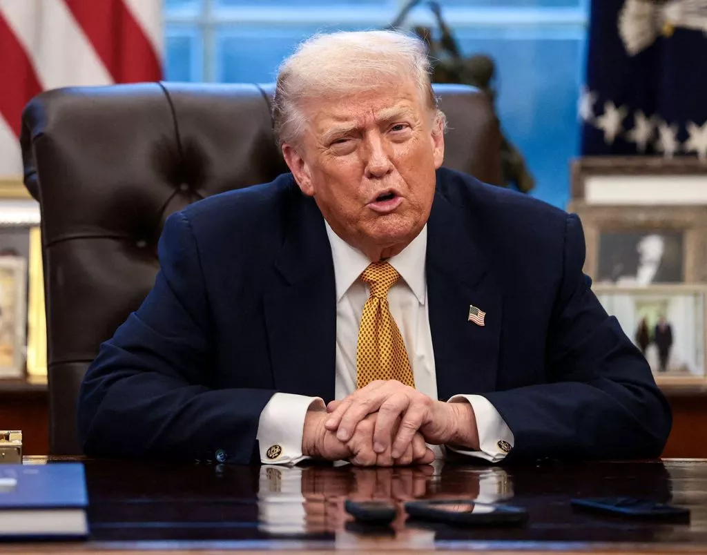 美国总统川普14日在白宫椭圆形办公室接受专访的神情。(路透)