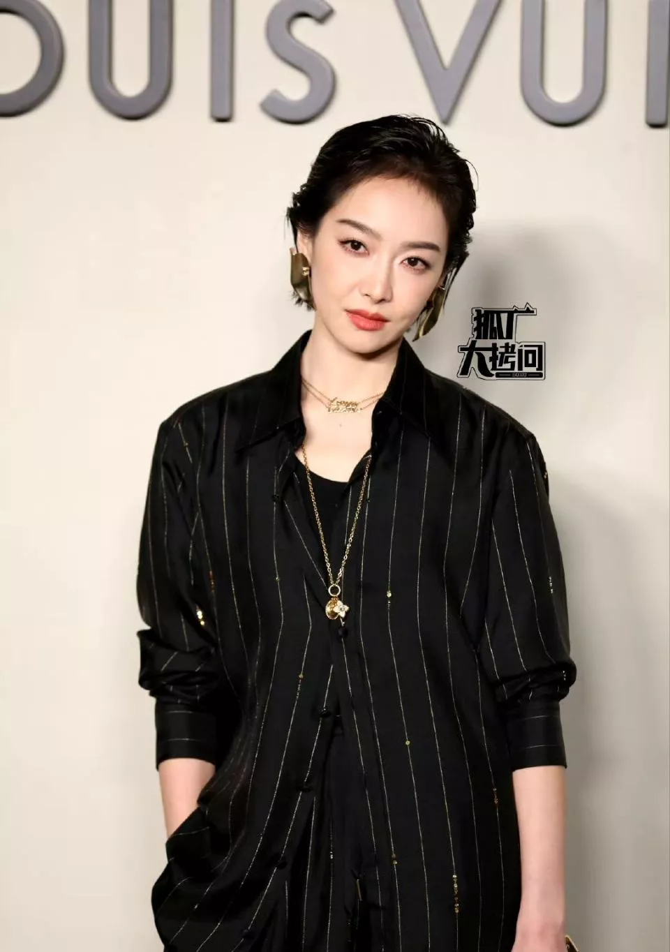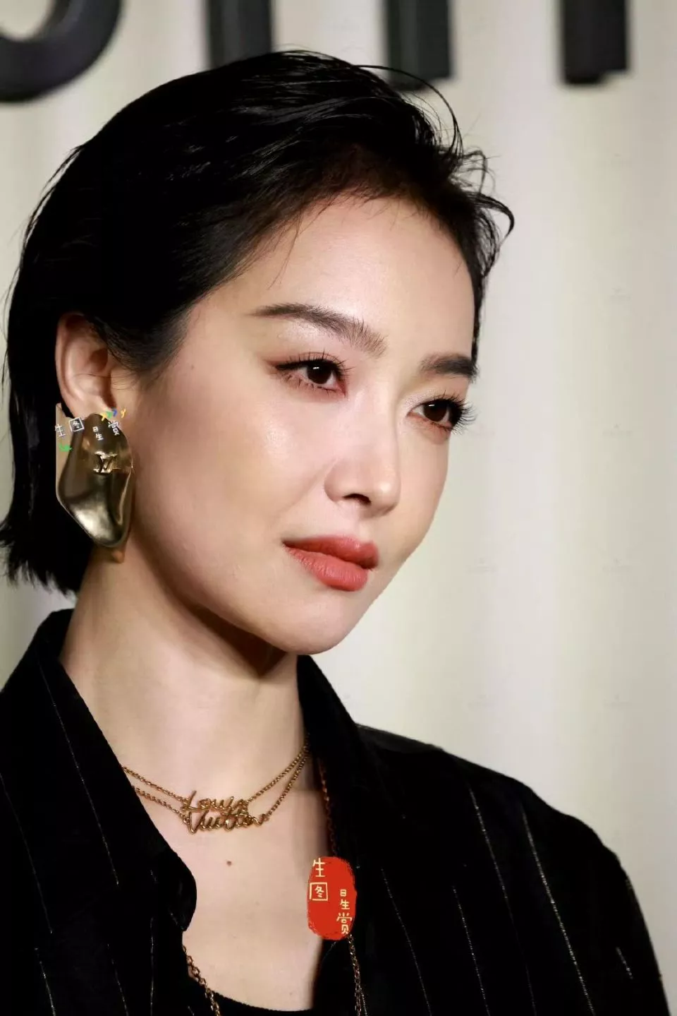 宋茜当天身穿一套黑色条纹套装,松软的材质让她整个人更加松弛,湿短发造型多了点痞帅的味道,配上夸张的金色耳饰,直接A到爆。