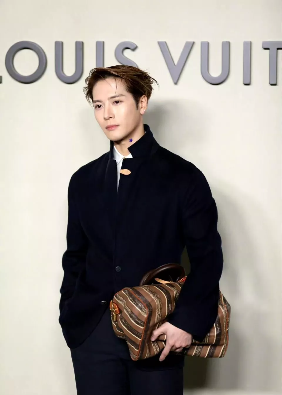 而王嘉尔在脖子上贴的宝蓝色星星,又给整套造型增添了几分趣味性。