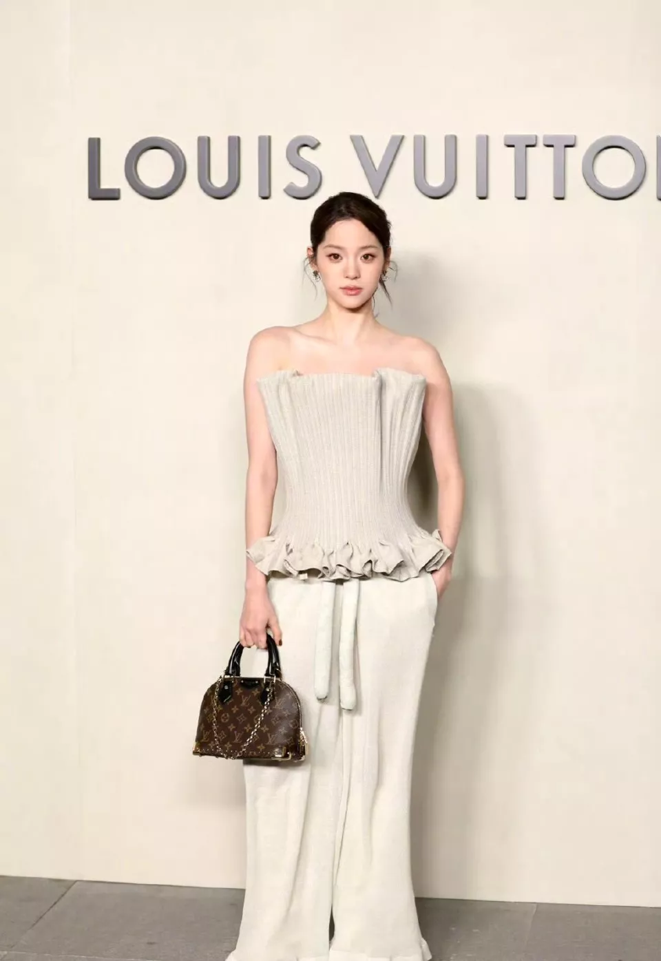 此次出席活动的她没有选择基础款套装,上半身抹胸花边针织衫,下半身搭配休闲花边阔腿裤。