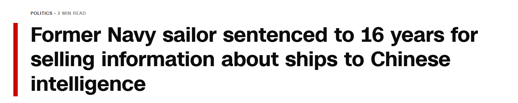 美国司法部近日宣布,一名前美国海军现役士兵因向中国情报人员出售敏感军事资料,被联邦法院判处200个月(约16年8个月)监禁。