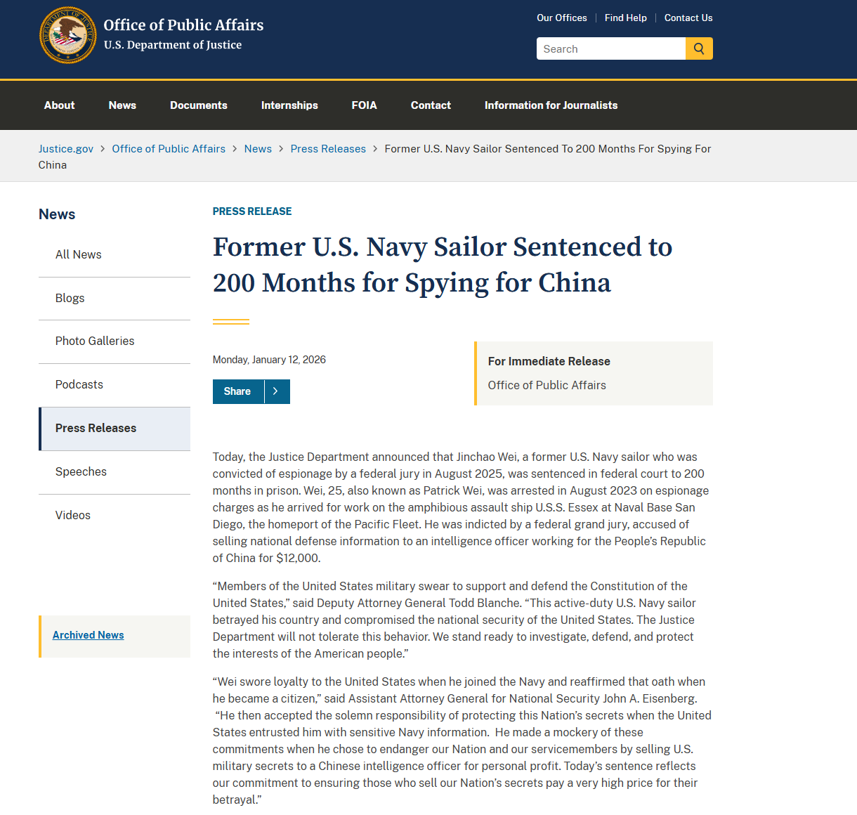 美国司法部负责国家安全事务的助理部长John Eisenberg在新闻稿中称,“魏金超加入美国海军时宣誓效忠美国,入籍美国后再次重申了这一誓言。他当时接受了保护国家机密的庄严责任,美国政府将敏感的海军情报委托给他保管。然而,他却为了个人利益,将美国军事机密出售给中国情报官员,危及我们国家和军人的安全,这无疑是对这些承诺的嘲弄。今日的判决体现了我们确保出卖国家机密者为其背叛付出沉重代价的决心”。