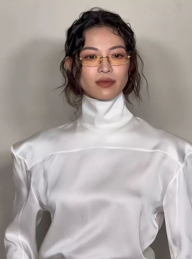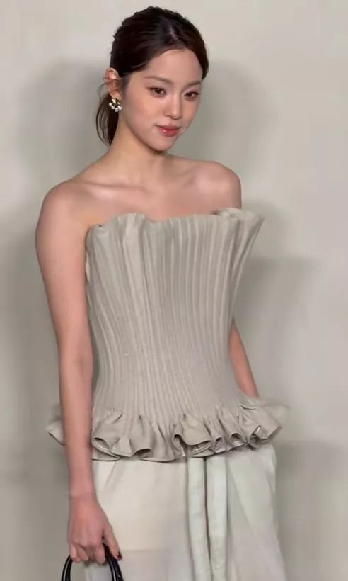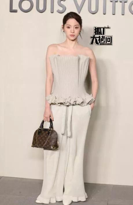 一整套柔软呢料抹胸配长裤,既展现了肩颈线,头肩比例太过完美,又让观众见识到了她独特又高级的审美。