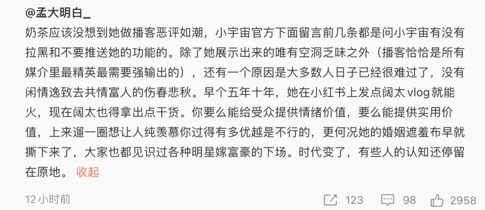 还有人批她的播客聊到的,不过是富人的伤春悲秋。