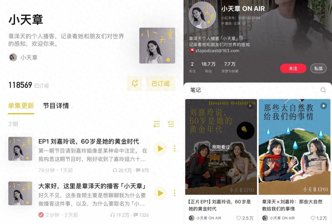 1月13日,章泽天的新播客《小天章》首期上线,热度不容小觑。截至1月14日22点,《小天章》在小宇宙的订阅数近12万,播放量迅速突破20万,登上小宇宙热门榜首位;其同步运营的小红书账号粉丝量达18.3万,节目点赞2.5万、收藏1.2万。