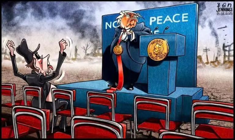 不少国家领导人心领神会,以色列的总理、阿根廷的总统、巴基斯坦的总理,纷纷提名特朗普,你不拿诺奖谁敢拿?以色列更是在大地上写下几个大字:将诺奖颁给特朗普!
