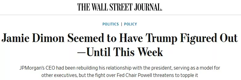 华尔街日报报道说,杰米·戴蒙一直在努力修复与特朗普之间破裂的关系,但围绕美联储主席鲍威尔的争议,正让他们两位的关系面临再次面临破裂的风险。