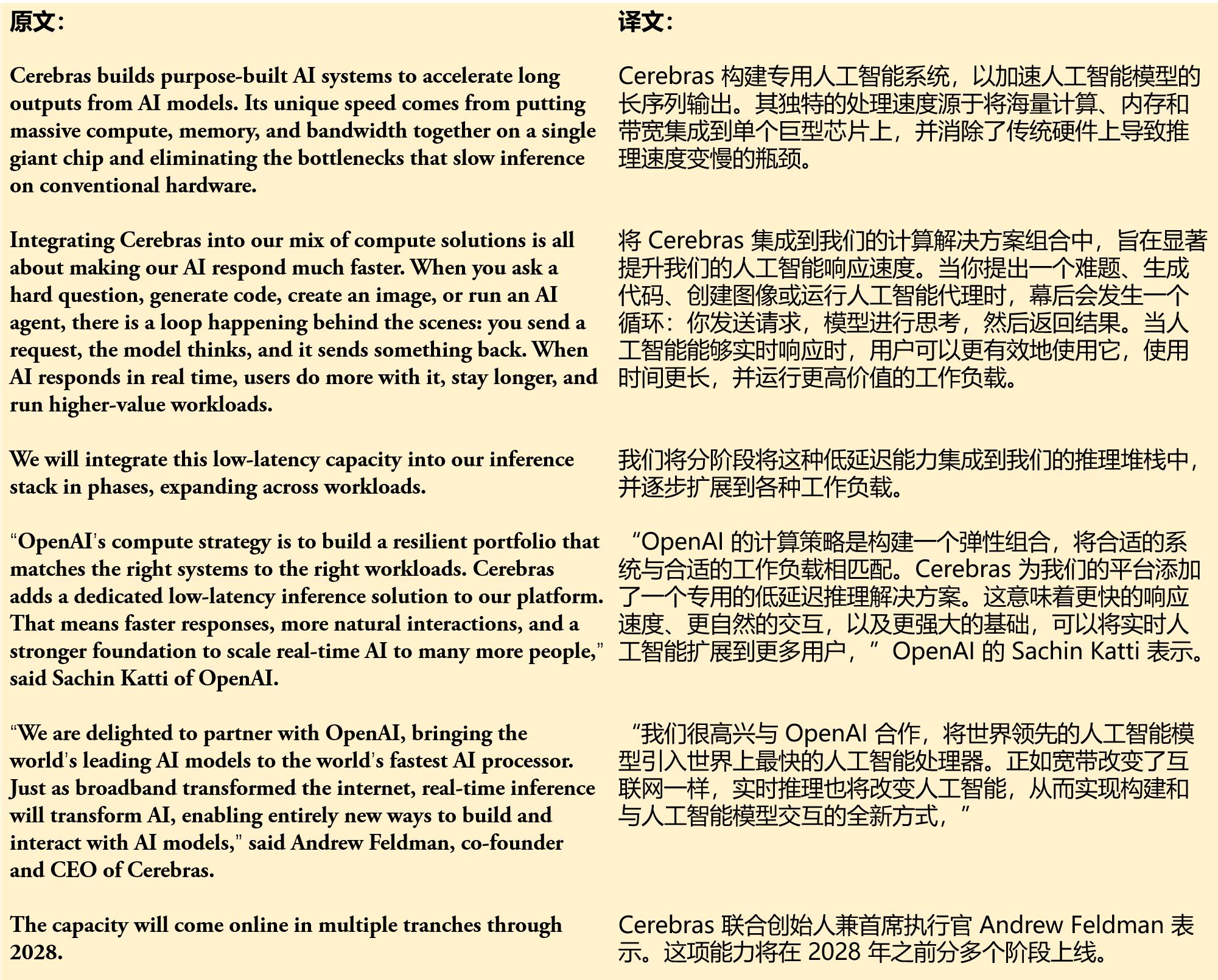 下方的文本来自OpenAI最近发布的一篇新闻稿,内容是OpenAI与AI芯片独角兽Cerebras建立合作关系。输入英文原文后,ChatGPT Translate用时不到5秒便给出了翻译结果。