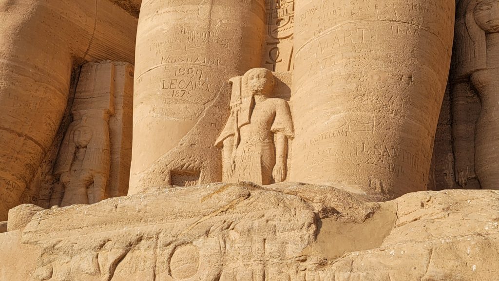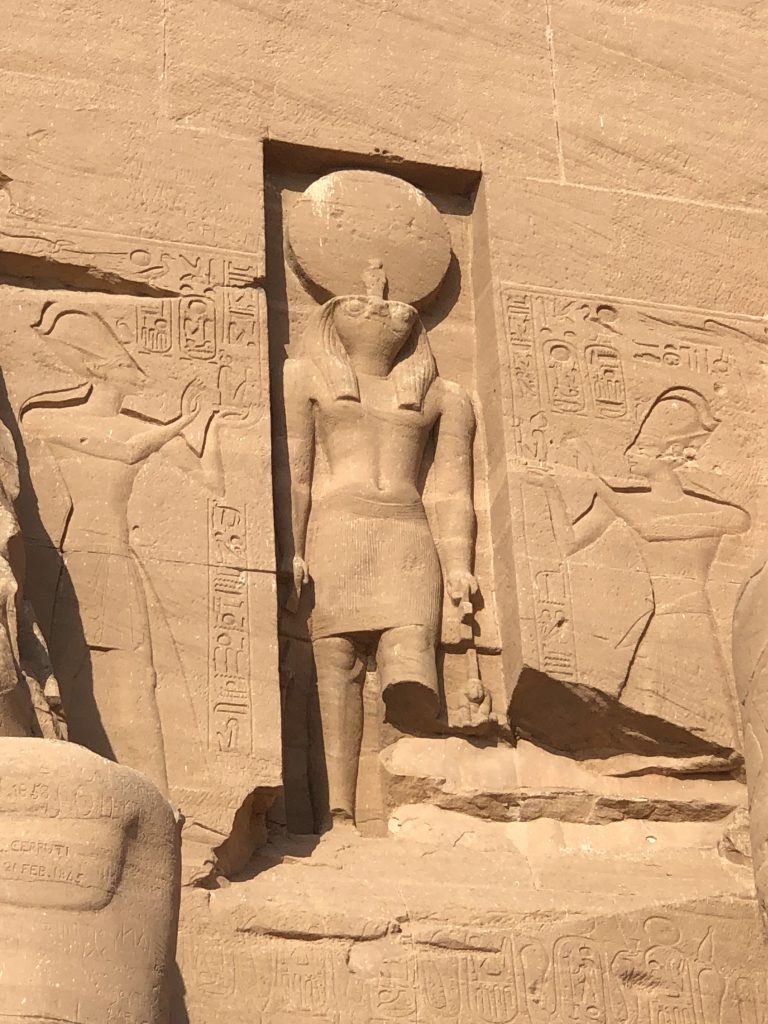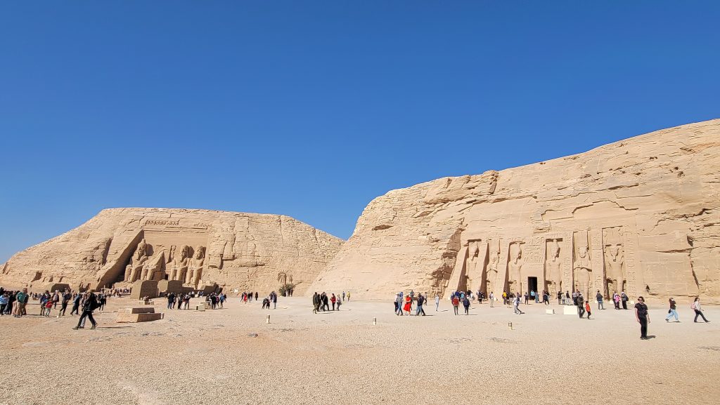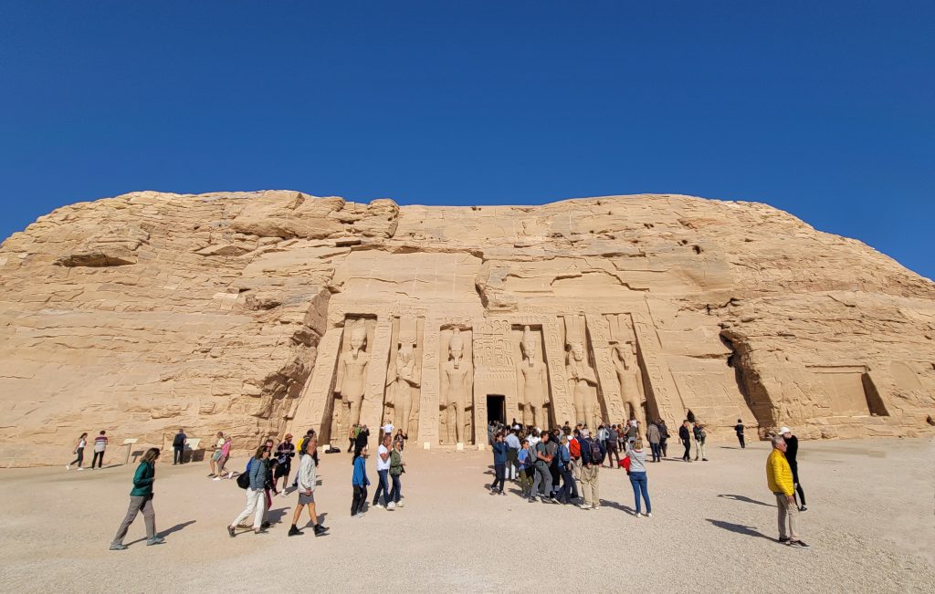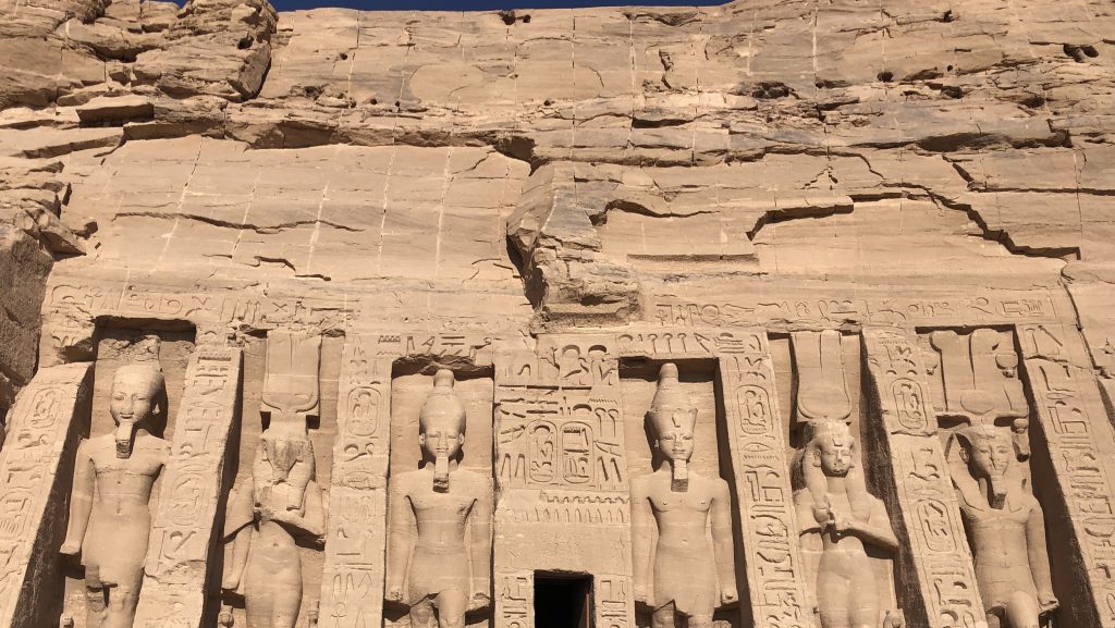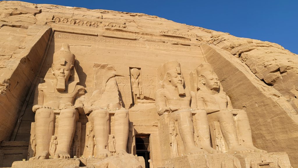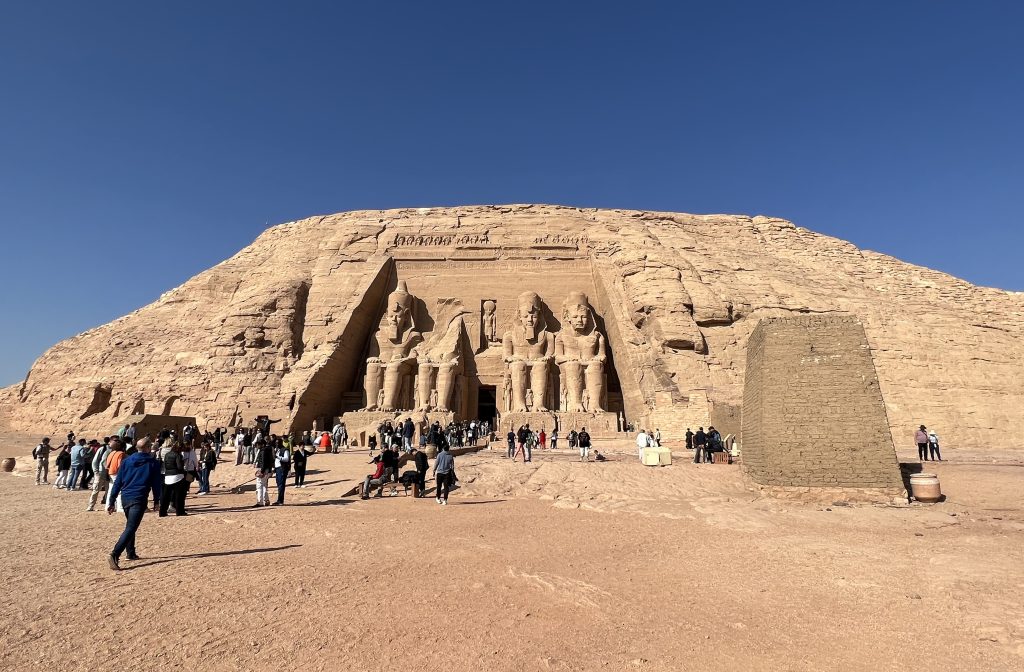 四尊巨大的拉美西斯二世坐像,每尊约 65 英尺(20 米)高,雄踞于大神庙正面。