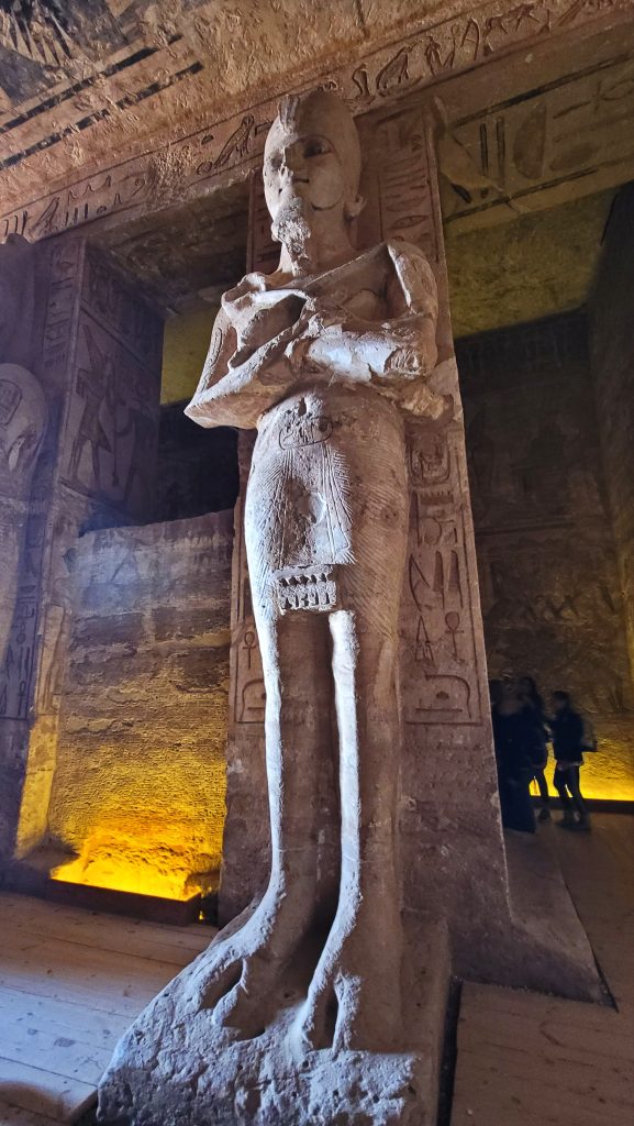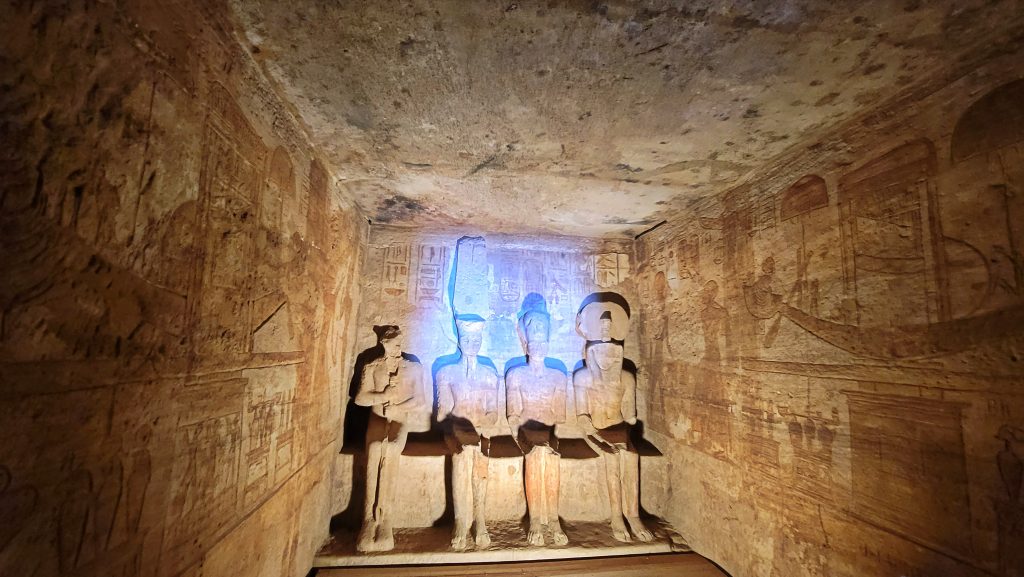 大神庙内的“至圣所”内殿,圣殿内有四尊坐像,分别是普塔神、阿蒙-拉神、拉美西斯二世(神化)和拉-霍拉克提神。每年两次(大约在 2 月 22 日和 10 月 22 日),阳光会照射到最右边的三尊雕像,被称为阿布辛贝神庙之光。 最左的雕像普塔则始终处于黑暗之中,象征着黑暗之神。