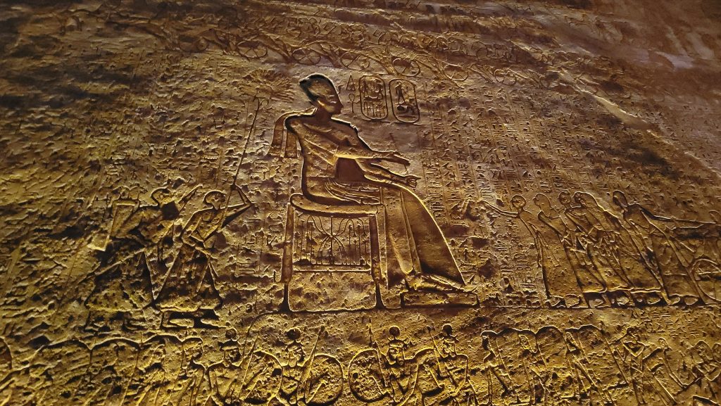 大神庙内部的一幅古埃及浮雕,画面描绘了拉美西斯二世坐在王座上,周围环绕着象形文字以及士兵和侍从。