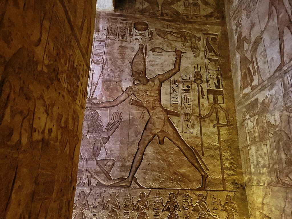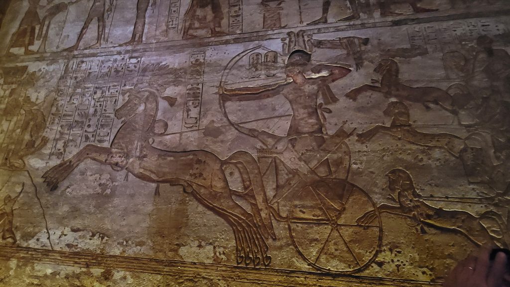 墙壁浮雕描绘了法老拉美西斯二世乘坐战车,在与赫梯人的战斗中射箭的场景。