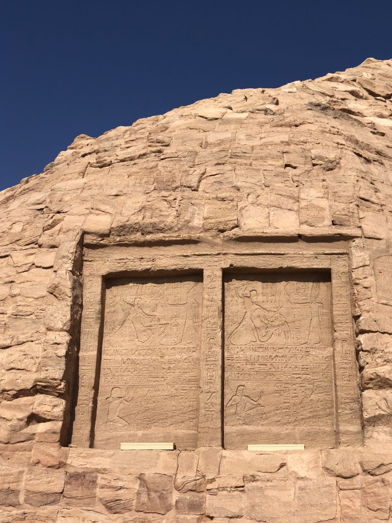 阿布辛贝神庙岩壁上的双石碑,以凹浮雕刻画法老击败敌人的场面,旁立库什总督塞陶,阳光下阴影深刻,气势鲜明。