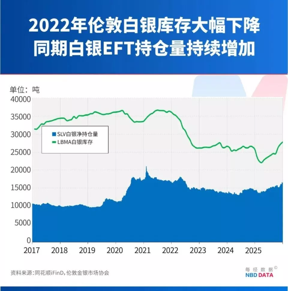 在遭受2022年的“重创”后,全球地上白银库存降至4万吨以下,这一数量约等于近年全年的全球白银实物需求量。然而,如果进一步考虑白银ETF锁仓的库存占用,实际可交割的白银其实远没有这么多。2024年以来,全球最大白银ETF的持仓量出现增持态势,目前已超过1.6万吨。根据LBMA公开数据,2025年伦敦金库白银库存最紧张的时候,仅2.2万吨左右。